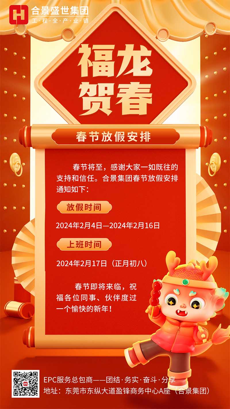 龍年行大運,喜迎新篇章。2024年新春佳節將至,根據國家節假日放假規定,結合我司實際情況,決定2024年春節放假安排如下:
