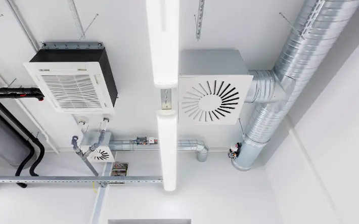 許多項目都傾向于選擇第三種方式。但需要注意的是,這種布局方式會減少下方上技術夾層(靜壓箱)的高度。為了確??諝饬鲃拥姆€定性和日后的FFU日常維護,必須保持一定的凈高。根據合潔科技電子潔凈工程師的建議,最小的凈高應為1.5米。